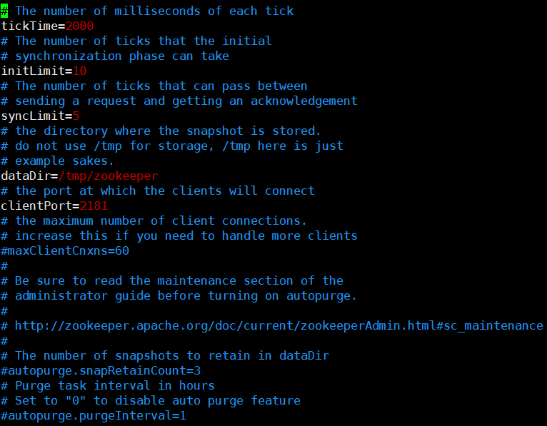 注意:dataDir=/tmp/zookeeper意思是快照数据会存在/tmp/zookeeper目录下,不要使用/tmp目录存储数据,因为/tmp目录存储的临时数据,会定时清空数据,需要自定义目录,这里的/tmp/zookeeper只是示例,通常会在Zookeeper的安装目录下创建zkData目录存储数据
