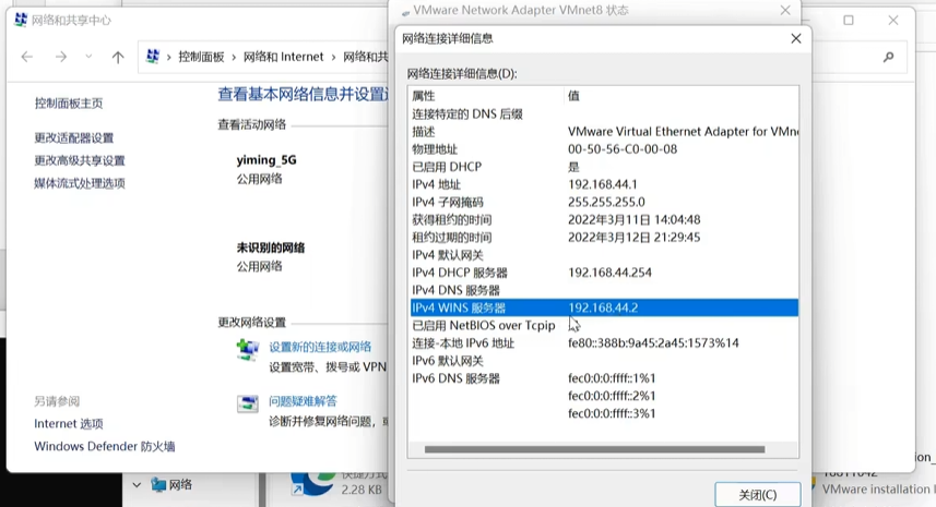 - 在windows的网络和共享中心菜单中,WLAN是无线网卡,还有VMnet1和VMnet8两个网卡,点开两个网卡点击详细信息,IPV4地址就是当前网卡地址,这个地址就是网关,虚拟机会通过该地址转发网络数据包,IPv4 WINS服务器的ip地址也可以作为网关【网关可以有两个】,设置NAT模式的虚拟机的网关地址必须和这个VMnet8选项卡下的windows网关中的一个相同才能正常联网