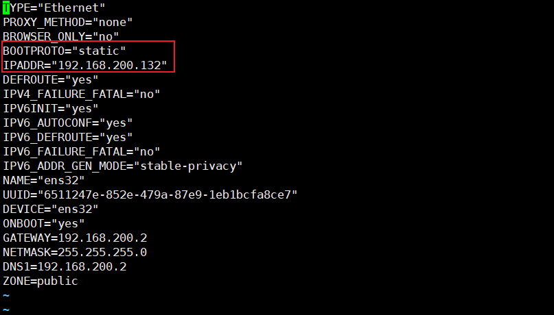 8.8.8.8TYPE="Ethernet" PROXY_METHOD="none" BROWSER_ONLY="no" BOOTPROTO="static" IPADDR="192.168.200.135" DEFROUTE="yes" IPV4_FAILURE_FATAL="no" IPV6INIT="yes" IPV6_AUTOCONF="yes" IPV6_DEFROUTE="yes" IPV6_FAILURE_FATAL="no" IPV6_ADDR_GEN_MODE="stable-privacy" NAME="ens32" UUID="6511247e-852e-479a-87e9-1eb1bcfa8ce7" DEVICE="ens32" ONBOOT="yes" GATEWAY=192.168.200.2 NETMASK=255.255.255.0 DNS1=192.168.200.2 ZONE=public1